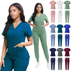 Vネック医療用スクラブトップとドローストリングジョガーパンツセット、病院用ユニフォーム、4ウェイストレッチ看護用スクラブスーツ、ユニセックス